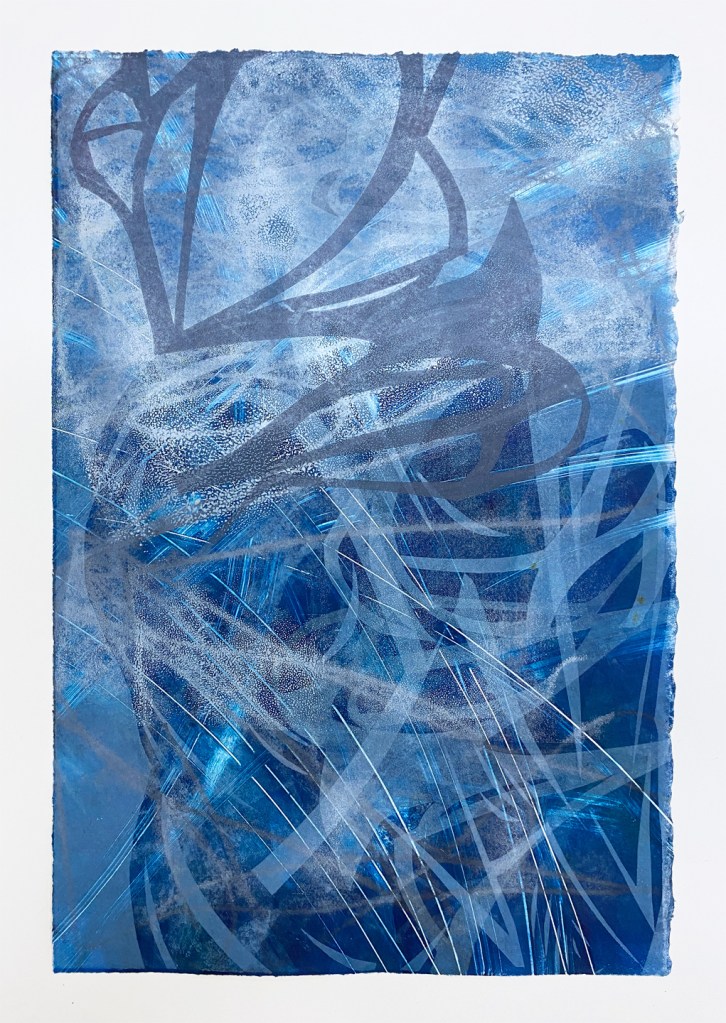 Through the investigation of wind, weather, light, amoebae, cosmos, and the body’s internal void, my work depicts the unseen and the intangible, providing a glimpse into some place else. Beams of light contort into forest limbs and then flicker, approaching dissolution. Foregrounded knots of intestinal sludge divide the earth and the ether. Gravity disappears in the viscous superimposition of abstracted forms.