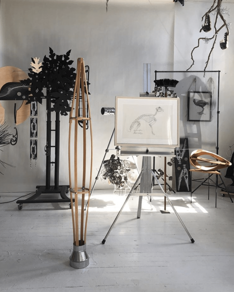 Noël Hennelly’s work is primarily sculptural – using construction, fabrication and assembly, along with combines incorporating shapes and images drawn from industry and the natural world. The primary materials are wood, with metal elements, fasteners and supports, often mobilized on casters. The works are layered, hinged, wrapped, and pinned. Pieces interact with all surfaces of the space: suspended from the ceiling, standing, rolling, and bolted to the wall. The methods of attachment allow some works to move with air currents or rock when jostled. There is a marked contrast in scale: some close to the floor, others 10 -12 feet in height. The colors are generally subdued: mainly black, silver and wood, along with brilliant polychromed pieces.