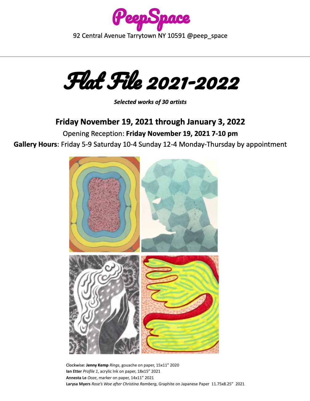 Regular Hours: Fridays 4-10pm; Saturdays 10am-4pm; Sundays 12-4pm. For further information please contact PeepSpace at PeepSpaceNY@gmail.com