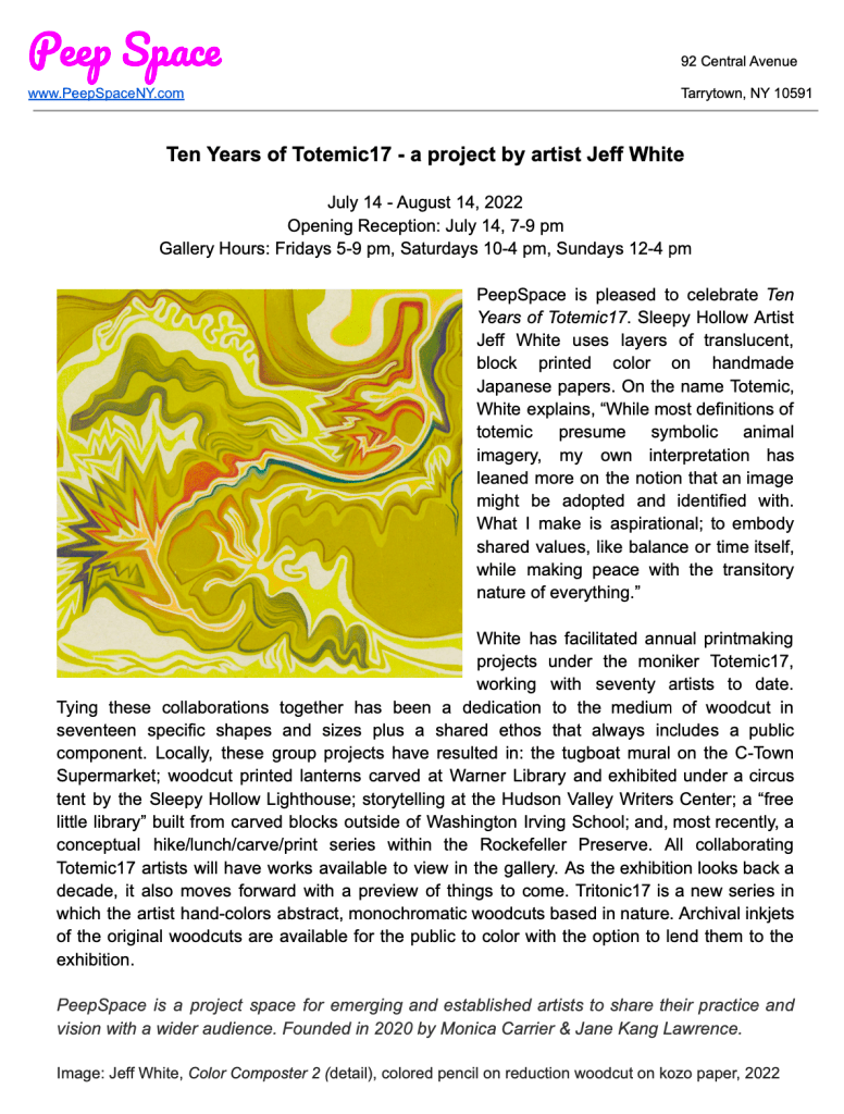 PeepSpace is an artist-run project space in Tarrytown, NY, founded in 2020 for emerging and established artists to share their practice and vision with a wider audience.