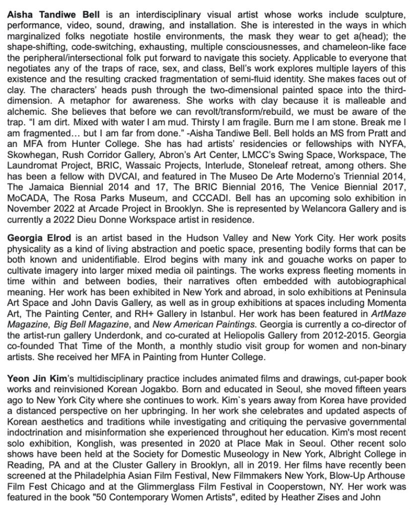 Works by: Yasmeen Abdallah, Gregory Amenoff, Sarah Anderson, Imogen Aukland, Marguerite Bailey, Amanda Baker, Glen Baldridge, Itziar Barrio, Natalie Beall, Michael Berryhill, Daniel Bozhkov, Noah Breuer, Monica Carrier, Blake Marques Carrington, Jacqueline Cedar, Chloe Scout Nix, Angela Connant, Paloma Crousillat, Jeremy Dine, Kelly Driscoll, Courtney Dudley, Stella Ebner, Katherine Evans, Brad Ewing, Nadja Frank, Michael Gaillard, Mark Gens, Glenn Goldberg, Langdon Graves, Raphael Griswold, Eric Ramos Guerrero, Barry Hazard, Giorgio Handman, Volker S Hueller, Elizabeth Insogna, Aram Jibilian, Lou Joseph, Ayesha Kamal Khan, David Kennedy Cutler, Jon Kessler, Alison Kudlow, Marie Lorenz, Joshua McCall, Anne-Marie McIntyre, Donna Moran, Nazanin Noroozi, Wilhelm Neusser, Iviva Olenick, Lauren Pakradooni, Erin Perrazzelli, Ben Quesnel, Henry Rosenberg, Alex Russi, AV Ryan, Lara Saget, Emma Schwartz, Edgar Serrano, Jeremy Shaeffer, Steve Shaheen, Louise Sheldon, Dasha Shishkin, Mae Shore, Felix Shumba, Lior Shvil, George Skoufas, Jackie Slanley, Ujin Song, Jomar Statkun, Christine Stiver, Jacquelyn Strycker, Jess Blaustein, Kristen Jordan, R. Blair Sullivan, Molly Surno, Rachel Sydlowski, Dominic Terlizzi, Jesse Weiss, David Wells, Hollis Witherspoon, Rona Yefman, Asa Gauen, James Gortner, Gaberial Meldahl, Zefrey Throwell
