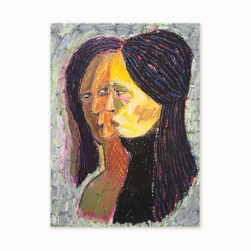 I use figuration as a way to explore psychology, societal expectations, and culture from a feminist perspective. I use the portrait as a vehicle for inventing characters that are in conversation with age-old archetypes, composited from personal history, mythology, and science fiction. These oil pastel drawings are explorations for new, larger works and primarily depict women together in some scenario that speculates as to the narrative conditions: the where, when, why, and who. Through the gesture, placement, and proximity of the participants, there is subtle humour, tenderness, and social commentary rendered in quirky colour and palpable texture.