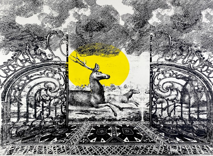 sculptures. Modular matrices printed on paper cover existing architecture, creating illusionary spaces with wallpapers, furniture, decorative objects, flora, and fauna. Well suited to mimicry and duplication, screenprinting is used to its maximalist effect. Installations consist of hundreds or thousands of discrete prints on paper. I am enchanted by material culture and artifacts of excess while simultaneously wanting to destroy systems that allow disparate polarities to exist. To face and dismantle the past for the sake of new beginnings, even if those beginnings are born of conflicting times is an attempt to avoid repeating grave mistakes. Through this examination and deconstruction of society, I also