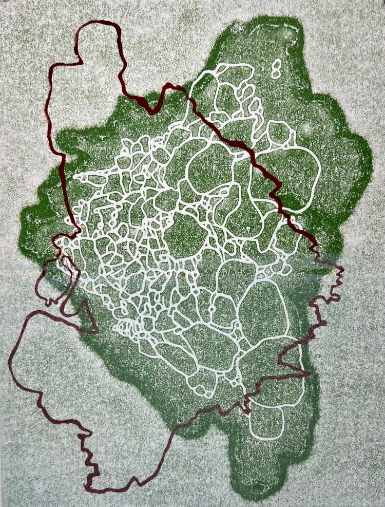I began making The Walking Mountain drawings in 2014 with about 100 works on paper to date, including watercolor, colored pencil, graphite, ink, and relief print, and collage. Originally inspired by the piles of rocks, or cairns, I saw in the mountains and countryside in South Korea and China, they often came into being as a collective form of orientation: one person places some stones down, then the next person walking the path adds more stones. In addition to the rural areas, the form of the pile kept emerging to me in the cities; ubiquitous as piles of bricks waiting to be used for construction, piles of concrete debris from demolished buildings. In this drawing project, I’m addressing the continual state of