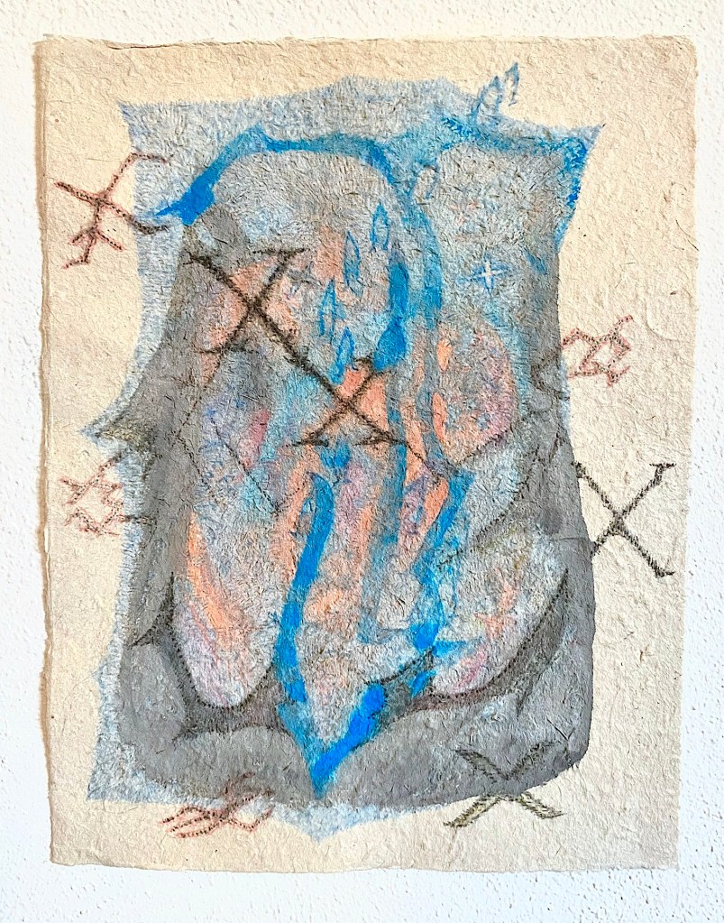 The drawings are made with watercolor, graphite and colored pencil on lokta paper. The paper’s cloth-like texture allows me to etch into the surface like a copper plate or embroider marks that scratch or dig into the rag. They become objects on a two-dimensional surface. Through this process I am able to give my full attention as I tend to each one—an act of paying homage to the ground.