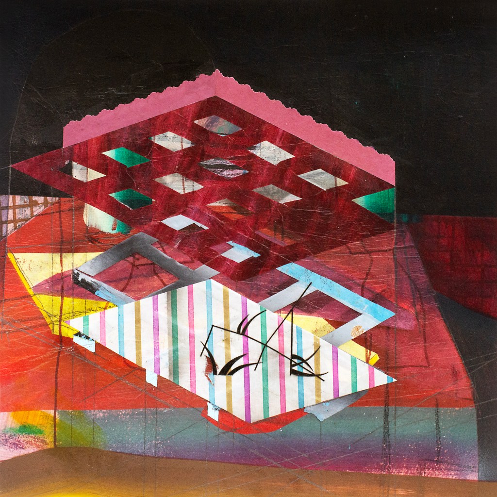 Laid Out, Graphite, ink, laser cut paper, found materials, color pencil, acrylic on paper, 16 x 16 inches, 2024, $450